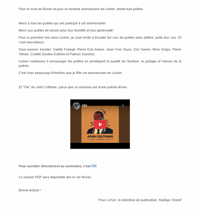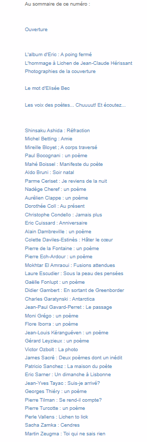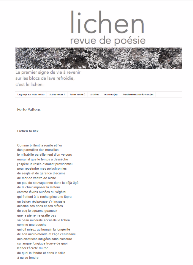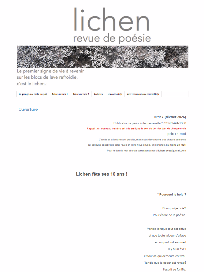 La revue Lichen a 10 ans ! Dans ce numéro spécial anniversaire, un beau sommaireauquel j’ai le plaisir de me joindre avec un petit grain « végétal » et le poème Lichen to lick. Bon anniversaire à la revue et bravo à Nadège Cheref et Elisée Bec, l’actuelle et l’ancien responsable de la revue.