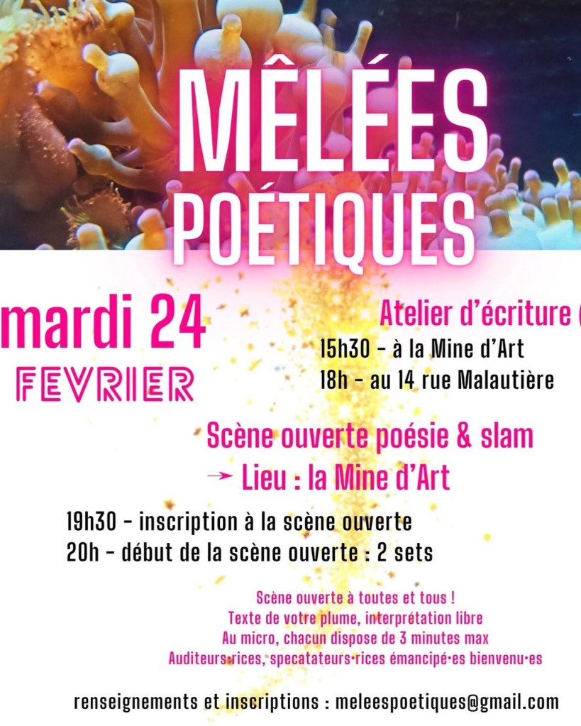 Je serai ce mardi 24 février à la Mine d’art à Dieulefit dans la Drôme pour une nouvelle session (la première me concernant) des Mêlées poétiques. La scène ouverte est prévue à 20h00. Au plaisir de vous y croiser !