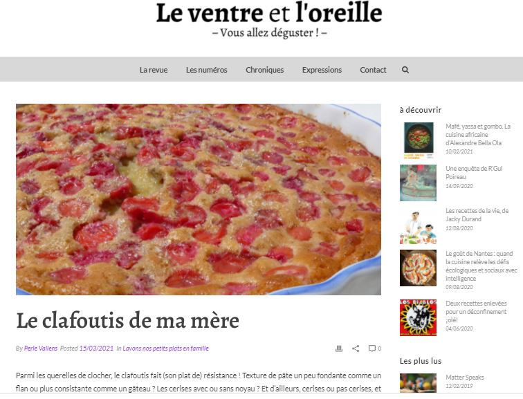 C’est à la revue en ligne Le Ventre et l’Oreille (qui diffuse également sous format papier sur la gastronomie et la musique), que j’ai proposé ce morceau d’anthologie familiale qu’est le clafoutis maternel, exclusivement aux cerises de Montmorency. A lire ici.