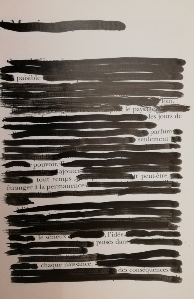 Ceci inaugure une série de caviardage. Il s’agit de biffer à l’encre (en noir, couleur du caviar) des mots dans un texte, du nom d’une pratique qui date de la Russie du XIXeme siècle, devenue d’usage poétique, notamment récemment popularisé par Lucien Suel.