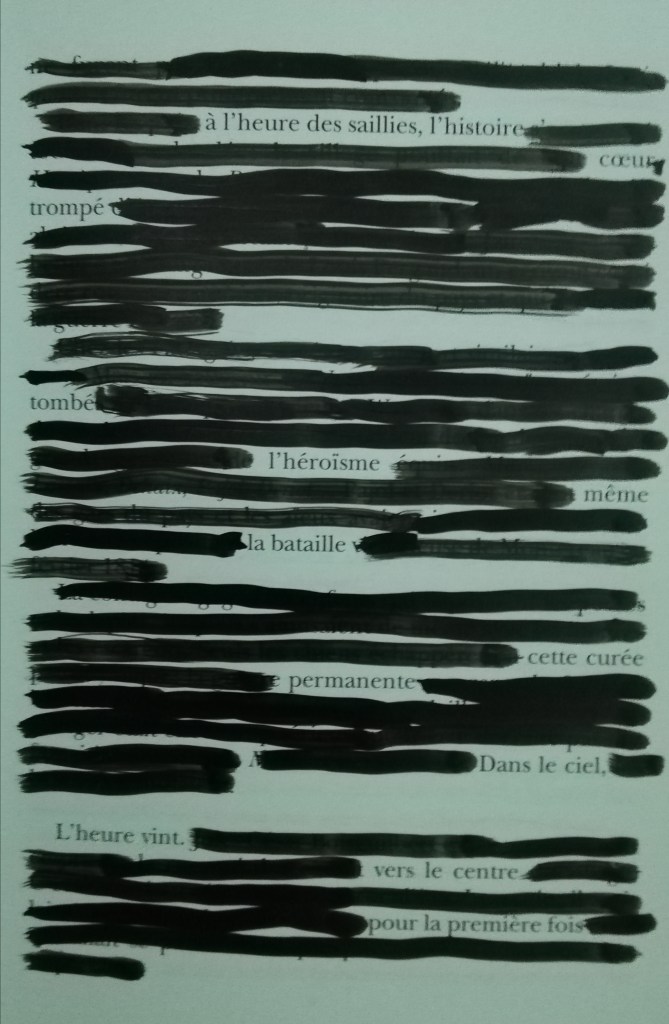 J’utiliserai un seul livre pris au hasard (presque) de 136 pages, soit 136 caviardages (presque)… Voici le premier.