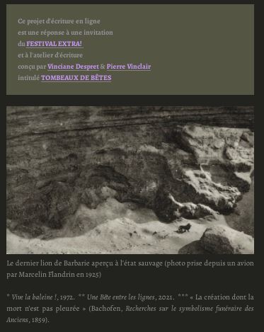 Zoodiac est un projet d’écriture lié au Festival Extra qui fait suite à un atelier d’écriture proposé par Vinciane Despret et Pierre Vinclair sur le thème de la disparition d’espèces animales, intitulé Tombeaux de bêtes. L’objet est d’écrire un adieu, un journal, un testament…