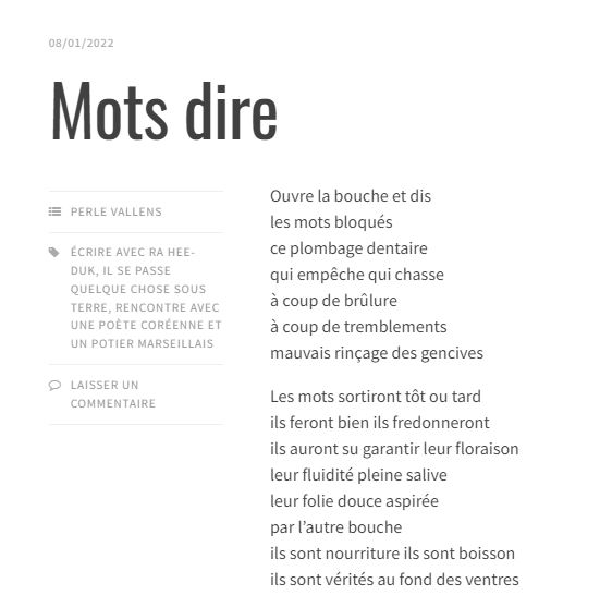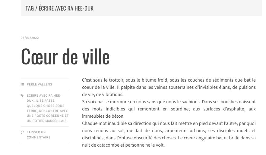 Ce mois-ci, ce sont Racine, Cœur de ville et Mots dire que Benjamin Milazzo, responsable de la revue avec Laura, a sélectionné pour le Miroir du jour. Vous pouvez lire ici tous mes textes parus sur la revue.