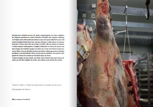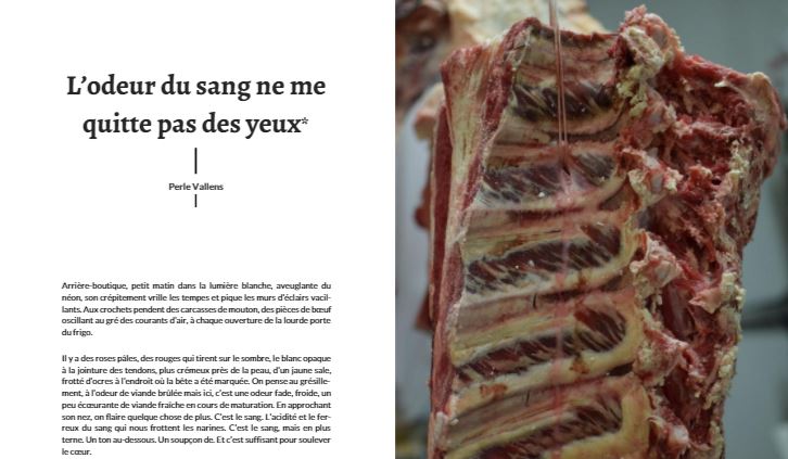 Ici il s’agit d’une voix qui évoque un certain dégoût de la viande, crue notamment, et du sang (serait autant fascination que dégoût..) et se déroule dans l’arrière-boutique d’un boucher, là où ont été prises les photographies qui illustrent la narration et qui sont donc également de moi.