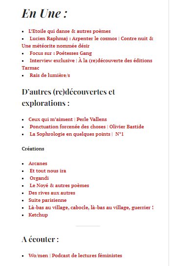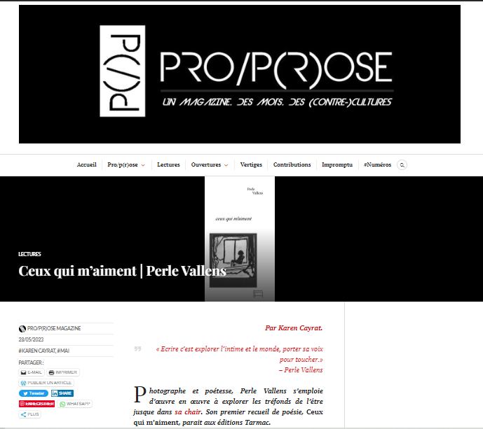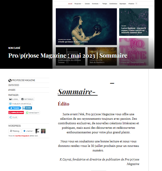 Pro/p(r)ose est une revue littéraire en ligne qui paraît tous les deux mois, le dernier dimanche, et diffuse interviews, recensions d’ouvrages, créations… Y avait déjà été publiés quelques poèmes en novembre 2021.