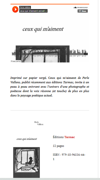 Sa créatrice, Karen Cayrat, a lu ceux qui m’aiment dans le numéro de mai 2023 mis en ligne hier et en fait un joli retour, une fine observation de ce premier recueil édité chez Tarmac qui fait d’ailleurs l’objet d’un article et une interview de Jean-Claude Goiri, l’éditeur. Est également incluse l’écoute d’un extrait audio sur soundcloud.