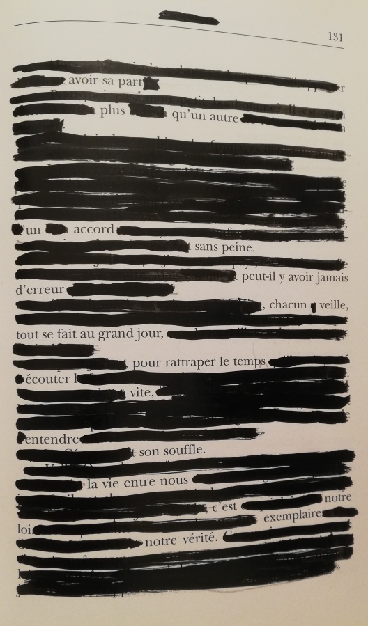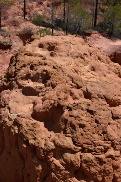 Déjà les nuages éparpillés au ciel, cotonneux, flottant, semblant en suspension, immobiles aplats fous sur le ciel impeccablement bleu. En deçà, les roches rondes, bosselées, doucement érodées, teintées dans la masse de jaune, de rouge, de grenat et de mauve, s’enflent et se défilent. Dans le loin, elles se hissent, émergent en surplomb des résineux. Elles accrochent des mousses et des lichens, s’ombragent des branches qui s’appesantissent, ployant et qui leur dessinent des visages dentelés. Là, clapote une flaque orange. Ici, craque une écorce d’arbre. C’est le son fluet, vivace d’une forêt d’ocre.