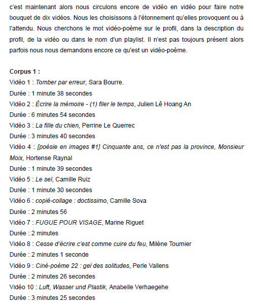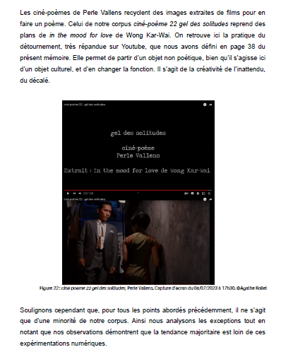 Dans le mémoire d’Agathe Rollet (master 2 – Université d’Avignon), qu’on peut lire ici, plusieurs corpus poétique qui prennent la forme de vidéo et une diffusion sur youtube ont été étudiés, voire disséqués. Me concernant elle a opté pour les ciné-poèmes, et notamment celui d’après in the mood for love de de Wong Kar-Wai, visible sur youtube ici.