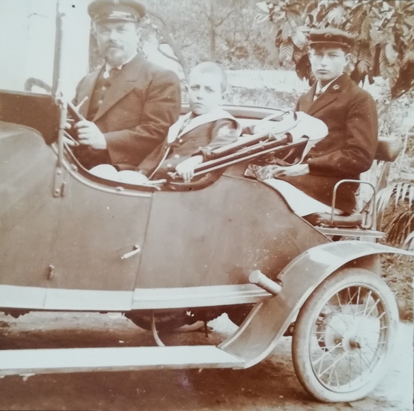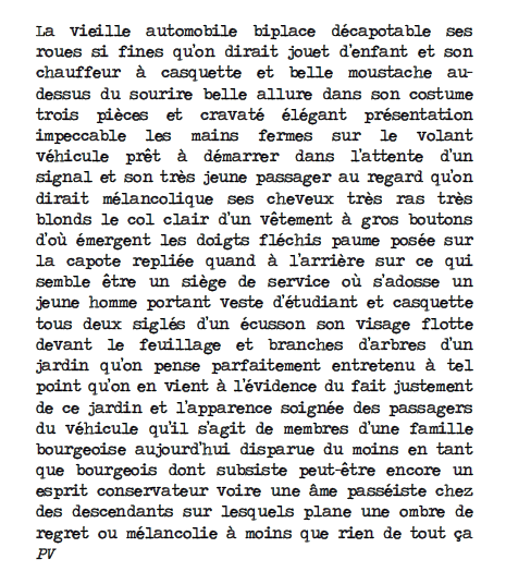 La vieille automobile biplace décapotable ses roues si fines qu’on dirait jouet d’enfant et son chauffeur à casquette et belle moustache au-dessus du sourire belle allure dans son costume trois pièces et cravaté élégant présentation impeccable les mains fermes sur le volant véhicule prêt à démarrer dans l’attente d’un signal et son très jeune passager au regard qu’on dirait mélancolique ses cheveux très ras très blonds le col clair d’un vêtement à gros boutons d’où émergent les doigts fléchis paume posée sur la capote repliée quand à l’arrière sur ce qui semble être un siège de service où s’adosse un jeune homme portant veste d’étudiant et casquette tous deux siglés d’un écusson son visage flotte devant le feuillage et branches d’arbres d’un jardin qu’on pense parfaitement entretenu à tel point qu’on en vient à l’évidence du fait justement de ce jardin et l’apparence soignée des passagers du véhicule qu’il s’agit de membres d’une famille bourgeoise aujourd’hui disparue du moins en tant que bourgeois dont subsiste peut-être encore un esprit conservateur voire une âme passéiste chez des descendants sur lesquels plane une ombre de regret ou mélancolie à moins que rien de tout ça