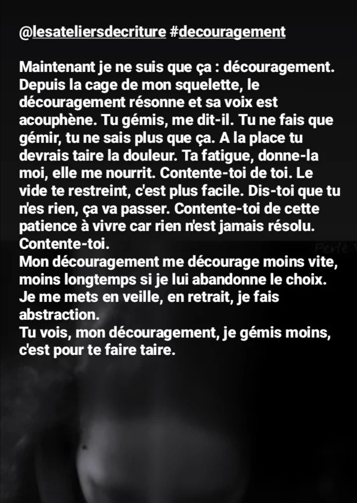 Depuis la cage de mon squelette, le découragement résonne et sa voix est acouphène. Tu gémis, me dit-il. Tu ne fais que gémir, tu ne sais plus que ça. A la place tu devrais taire la douleur. Ta fatigue, donne-la moi, elle me nourrit. Contente-toi de toi. Le vide te restreint, c’est plus facile. Dis-toi que tu n’es rien, ça va passer. Contente-toi de cette patience à vivre car rien n’est jamais résolu. Contente-toi.