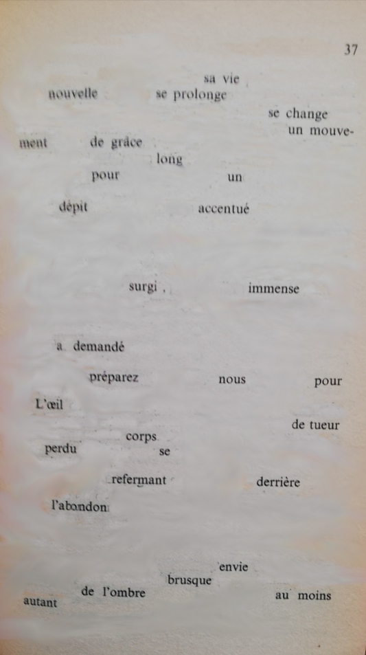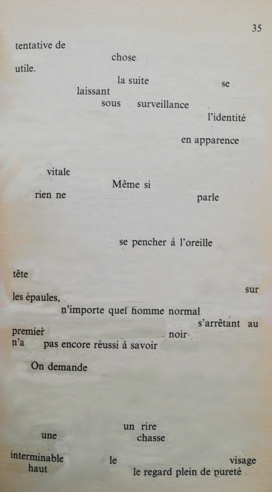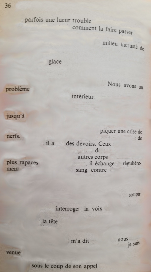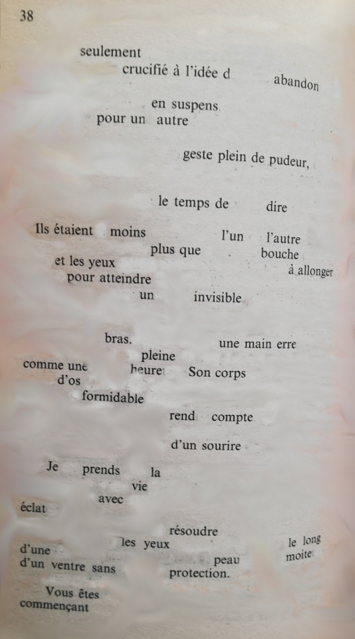 Bouche camouflage au bord du rouge un message caché tient dans une seule phrase sauras-tu le déchiffrer de tes propres mots mis bout à bout suffisamment de longueur pour ceindre le tour de ma taille cherche ma bouche de midi comme trésor sans piste balisée comme zénith d’un désir à répétition qu’on se repasse de main en main qu’on se répète électrique ma bouche scannée à ta bouche renouvelle son paysage en revisite de courtoisie en partage de parties communes d’une langue à l’autre faire l’état des lieux d’une virgule changer la ponctuation rallonger la longueur de la phrase ajuster la logique du plaisir le baiser désigne les lèvres comme principe d’action réciproque et osmotiques les salives échangées
