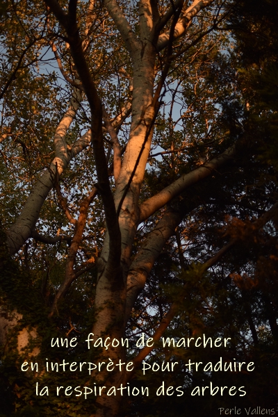Une façon de marcher est de ne pas se soucier de la destination une façon de marcher sans hésiter sans faire demi tour se laisser flotter une façon de marcher, juste suivre un signe dans l’air une indication qui frôle marcher en interprète pour traduire la respiration des arbres là où se relèvent les plantes aux branches juchées au-dessus du regard une façon c’est : se laisser caresser les jambes ou griffer (un genre de caresse) la ronce murmure quelque chose sur la peau et dessous la main passe des bribes et des feux vivaces au fond des pupilles s’allument graminées s’égrènent semaisons plein les chemins une poussée qui nous dit boire le ciel parfaitement alignés pieds décantent hissés sentiers une butte ou déprisonnés-libres la course pas un seul pas ne s’éprend s’étire évide devenu enjambée et pris un à un enfoncés dans des fleuves verts souffle sur la boue s’échappe un filet de vrai auquel j’avale