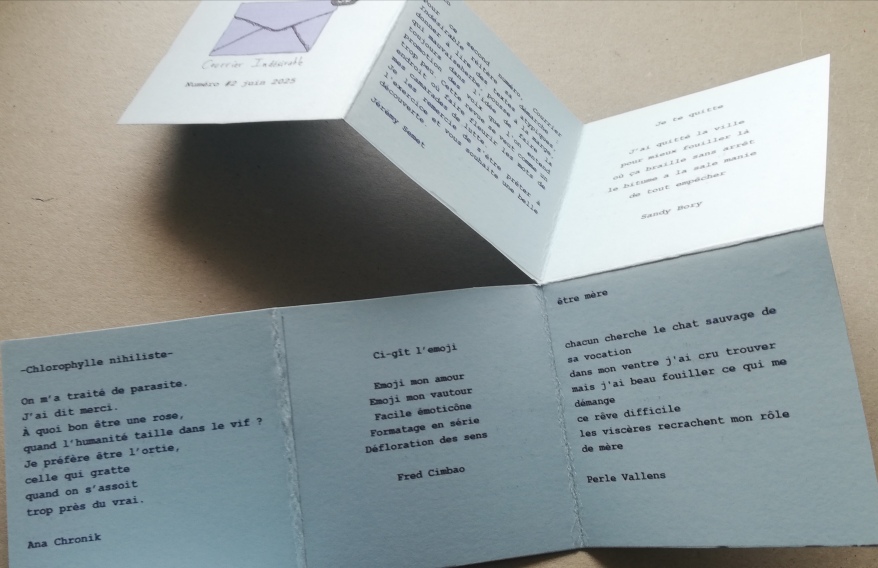 Courrier indésirable est une micro-revue ou un micro-fanzine qui se présente replié en tout petit format. Une nouvelle version de revues pliées parmi lesquelles Radical(e), dans laquelle je figurais avec photos et poèmes l’an passé, ou Vinaigrette, également revue amie.