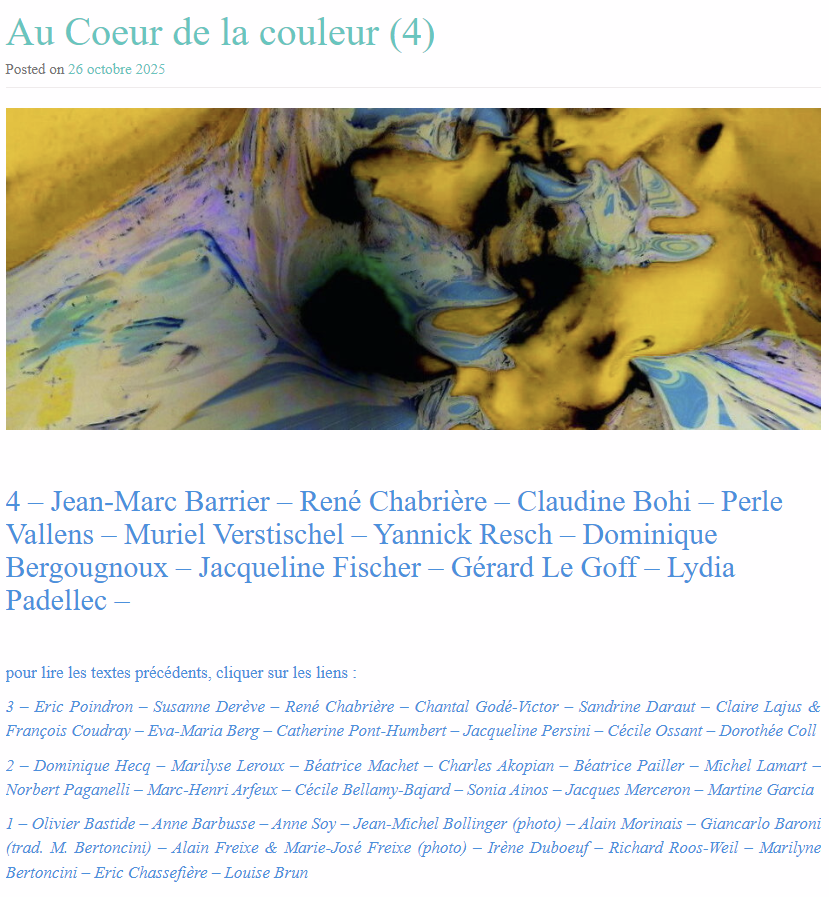 Le quatrième numéro de Hespérie, revue créée par Jean-Marc Feldman, vient de paraître. Je suis heureuse de voir un ensemble de poèmes sur le thème de la ménopause issus d’un (trop court ?) recueil (qui n’a pas trouvé d’éditeur), ainsi qu’une photographie. Merci à Jean-Marc pour son accueil dans les pages d’Hespérie aux côtés de noms appréciés et d’autres à découvrir.