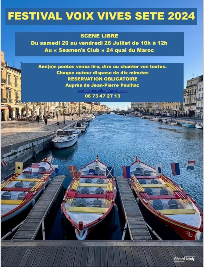 Lecture en scène libre au festival Voix Vives à Sète le 23 juillet entre 10h00 et 12h00 au Seamen’s (extraits de recueils et récits personnels et de poèmes en revue)