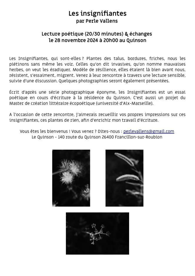 Résidence d’écriture du 18 au 29 novembre au Quinson dans la Drôme & sortie de résidence le 28 novembre à 20h00.