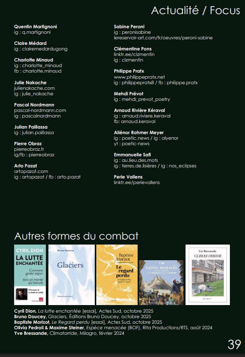 Le troisième numéro de Vert Combat, une collection de la revue Hélas, qui se veut l’écho poétique du changement global et de ses angoisses. C’est aussi une ode à la Terre et l’espoir d’un monde nouveau. Le numéro est téléchargeable ici. Ce numéro, dédié à la mémoire de Carole Bijou, présente des textes, des photographies, des dessins signés de nombreux autrices et auteurs. Il accueille également Retour de Sève :