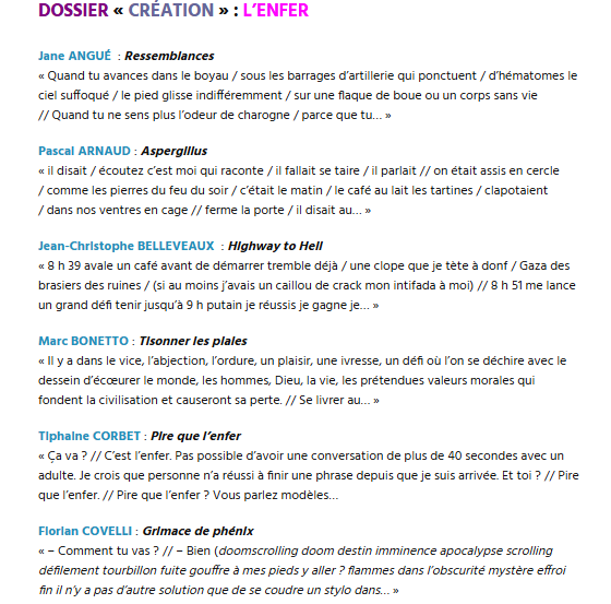 Le numéro 49 de la revue Dissonances vient de paraître, elle a pour thème l’enfer et on peut la trouver ici ou la commander en librairie. J’y signe un poème intitulé inferno dia.