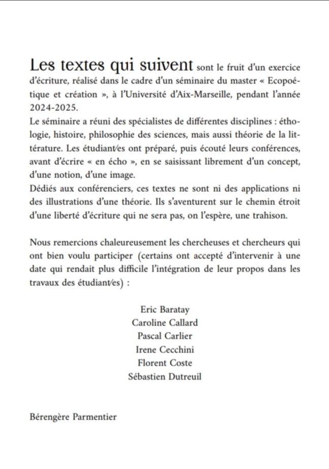 A l’œil nu qu’on ne verrait pas, filaments, extraits fongiques, débris d’insectes, décompositions végétales, aiguilles et akènes, pollens, graines et chatons, fragments d’écorce, branchages, feuilles dénervées, résidus résineux, exsudats racinaires, excréments, boulettes fécales, cadavres d’animaux, mucus et détritus microbiens, bactéries, micro-organismes tous digérés par des entités détritivores, ce que la terre recrache de déchets, la terre autophage, d’humus, son substrat, sa subsistance en partage.