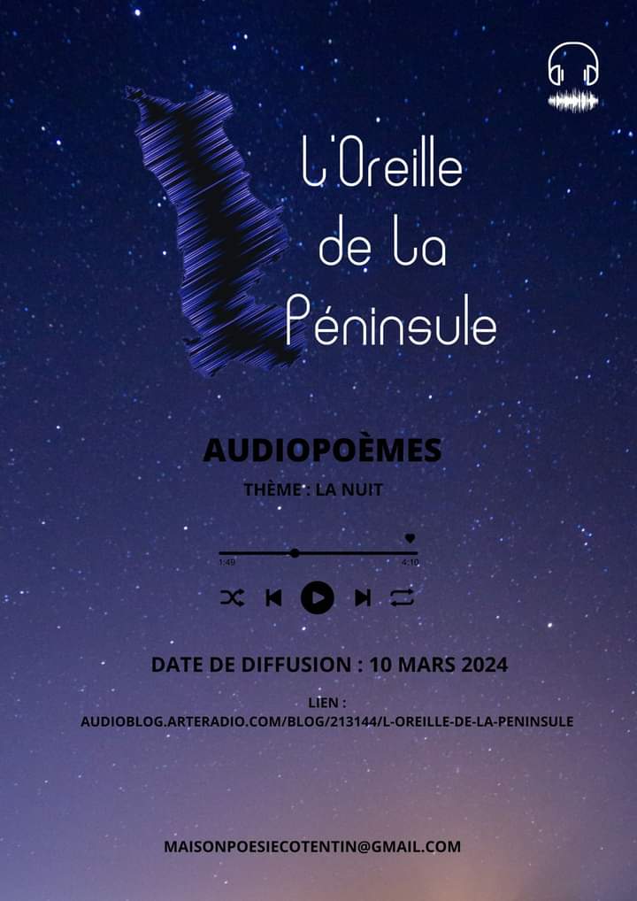 le prochain podcast de L’oreille de la Péninsule – Maison de poésie en Cotentin, qui diffuse divers sujets, interviews très intéressantes etc est cette fois-ci un podcast de poésie sur le thème de la « nuit » et sera diffusé le dimanche 10 mars à 21h00 ici : https://audioblog.arteradio.com/blog/213144/l-oreille-de-la-peninsule