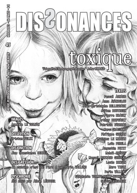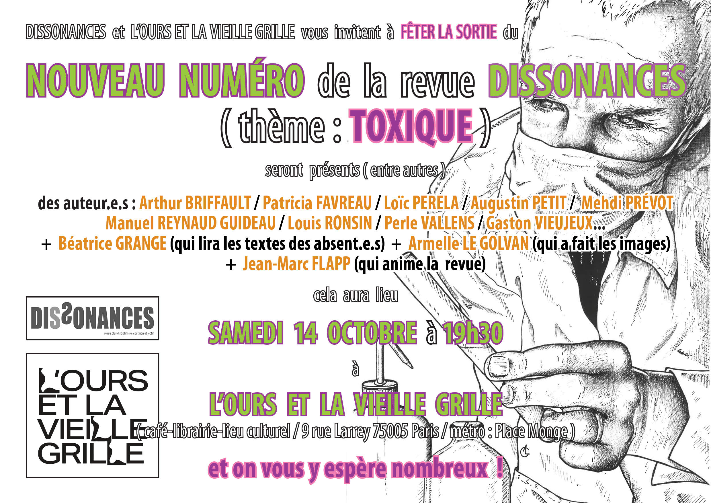 Le nouveau numéro de la revue Dissonances a pour but « toxique ». Le lancement aura lieu, avec lecture des textes et poèmes, le samedi 14 octobre 2023 à 19h30 à l’Ours et la vieille grille à Paris, à l’occasion du Salon de la Revue où Dissonances tiendra stand.