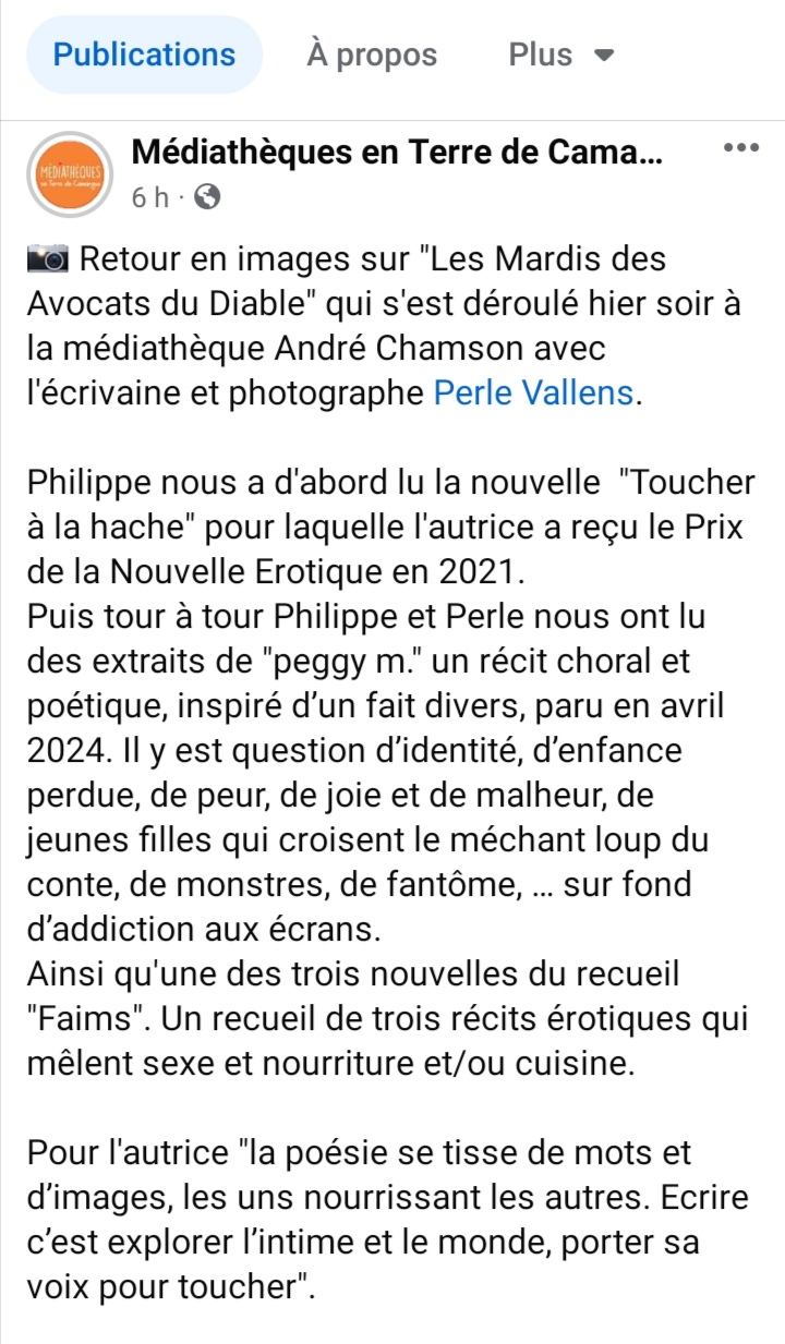 A la médiathèque d’Aigues-Mortes, à l’invitation de Philippe Béranger des Avocats du diable et à l’occasion de cette quinzaine en résidence d’écritures à La Laune (Vauvert) : présentation et lecture par Philippe d’extraits de Toucher à la hache (au diable vauvert), ceux qui m’aiment (Tarmac), Faims (Christophe Chomant), peggy m. (éditions la place)
