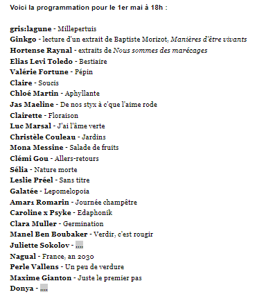 Ce soir s’écoute un nouve épisode de Mange tes mots, le podcast poétique, sur un extrait de l’iranienne Forough Farrokhzad « Je plante mes mains dans le jardin/Et je sais, je sais, je sais, je vais verdir ». Un peu de verdure donc dans les mots qui y seront distillés et dans les miens, puisque tel est le titre du texte que vous pourrez entendre. Rendez-vous à 18h00 et bonne écoute !