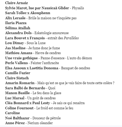Ce nouvel épisode de Mange tes mots est sur la citation de Alejandra Pizarnik « Je m’habille de cendres » et sera diffusé aujourd’hui à 18h00. Je suis heureuse de participer à nouveau à ce podcast poétique, c’est toujours une écoute riche, enchanteresse pour les oreilles et la tête. Le texte que j’ai mis en voix s’intitule Feinter l’anthracite.