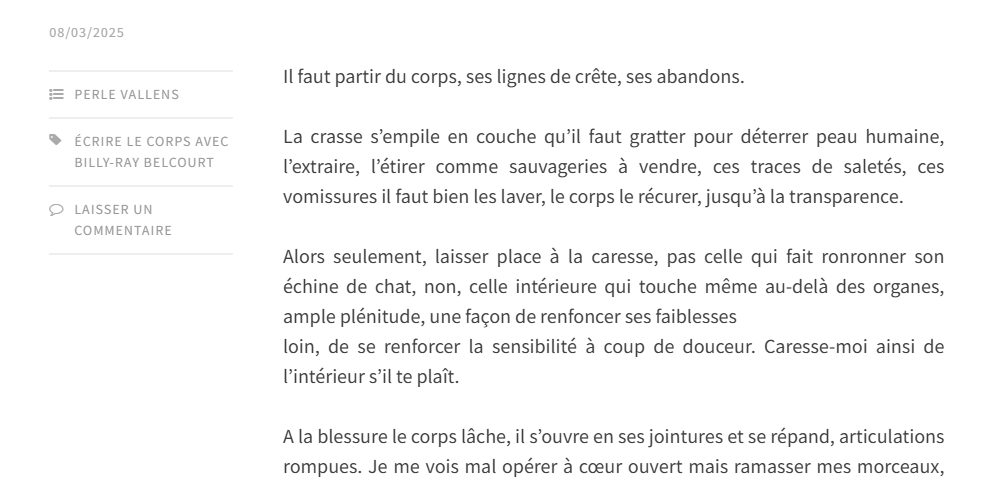 Dans ce numéro du 8 mars de la revue Miroir, impulsé par Laura Vazquez voici un nouveaux texte poétique autour du corps, à lire dans l’intégralité ici