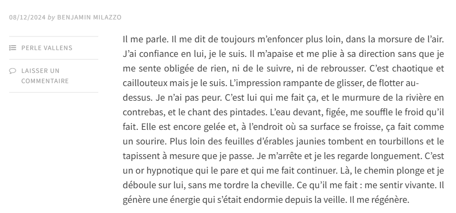 Il n’y a pas trente-six chemins pour voire trente-six chandelles. Il y a ce sentier qui part de la bâtisse principale, presque en face de la résidence. C’est déjà d’abord quitter la route principale qui mène au village, bifurquer à gauche on fait dos aux montagnes et on suit la direction de la résidence qui est indiquée sur un panneau peint. De part et d’autre, quelques fermes éparses, serres et granges, peu nombreuses, isolées entre elles par des champs de lavande d’un côté, terres en friches de l’autre. Après le ruisseau, à droite, on contourne par le bas et on laisse la voiture. Ici on doit continuer à pied par le sentier qui monte et longe la rivière en contrebas. On n’accède pas à la rivière, des fils électrifiés délimitent les possibilités. On doit suivre le sentier, son léger dénivelé, ses talus bordés d’arbres, entre son du vent dans les feuillages et cris d’oiseaux. Entendre un rapace et au loin, des pintades d’élevage chantent, un animal meugle, un fusil détonne, des chiens aboient. Ici, passent les vaches en été. En hiver ne passe presque personne. On entend toujours le bruissement de la rivière qu’on surplombe. A un moment, on ne la voit plus, le sentier s’est écarté et se poursuit en bordure d’une haie ouverte baignée de lumière. Il faut poursuivre jusqu’à une petite porte en bas, qu’un loquet ouvre, qu’il faudra refermer derrière soi. Là, deux pistes s’offrent l’une est un bout du monde qu’on arpente en grimpant puis s’éparpille en haut dans des clairières buissonnantes, une garrigue sèche, piquée d’arbres tremblant sous le ciel, d’ornières en redescente. En haut, un cadavre de camionnette, peinture écaillée, signature élimée « un vrai poulet », incongru dans ce paysage où rien d’autre, rien d’apparence humaine, que la camionnette plantée là, dont rien ne poussera. Mais si l’on prend à droite de la porte en bois, on longe une autre propriété vers où la rivière revient. Vaste étendue d’herbes sauvages, troncs d’arbres tombés, creux, gris et difformes sur la droite. Le sentier se fait ici étroit, minuscule, juste la place pour une personne. On y cheminerait à la queue-leu-leu. Ici, s’escarpe la colline sur le flanc gauche, plus pentue, drue, elle s’accidente. On suit un moment avant que cela ne se resserre. Le sentier se fraie, horizontal, à travers une forêt touffue. On pénètre alors dans une atmosphère dense, étrange, habitée. Ici, plus aucun son, un silence lourd, presque caverneux. Plongé dans l’ombre, on ressent la lumière verte, vivante qui émane d’être moussus, d’arbres chevelus, immobiles mais animés. Sensation d’un lieu très ancien, de vibrations lointaines, de pulsations, d’une énergie rare qui resurgit ici dans cet espace reculé. C’est un éloignement à la fois géographique et temporel dans ce recoin de forêt. Il n’y a plus de vrai sentier mais un passage sinueux, sur roche friable. Et là, calcaires concassés craquent sous le pas, rendent l’ascension difficile, très glissante par temps humide sur débris de pierres éclatées. Je sais qu’en haut existe une grotte, un refuge pour milliers de chauve-souris mais je ne les ai pas vues. Je reviendrai.