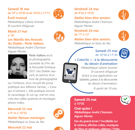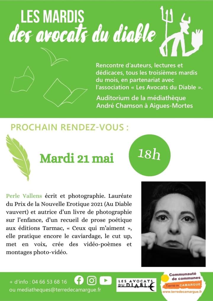 A partir de demain et jusqu’à la fin du mois, je serai en résidence à l’invitation des Avocats du diable/au diable vauvert, à La Laune (Vauvert) en petite Camargue, pour la seconde fois (la première c’était suite au Prix de la Nouvelle Erotique dont j’étais la lauréate 2021). A cette occasion, je serai mardi 21 mai à 18h00 à la médiathèque d’Aigues-Mortes, l’une des trois du réseau Médiathèques Terre de Camargue, pour un échange animé par Philippe Béranger des avocats du diable/au diable vauvert, et des lectures (peggy m., ceux qui m’aiment et divers autres textes publiés en revues notamment). Si vous êtes dans ce coin-là à cette date, venez, je serai heureuse de vous y croiser (et j’aurai quelques exemplaires de livres avec moi : peggy m., ceux qui m’aiment, Faims, Que jeunesse se passe).