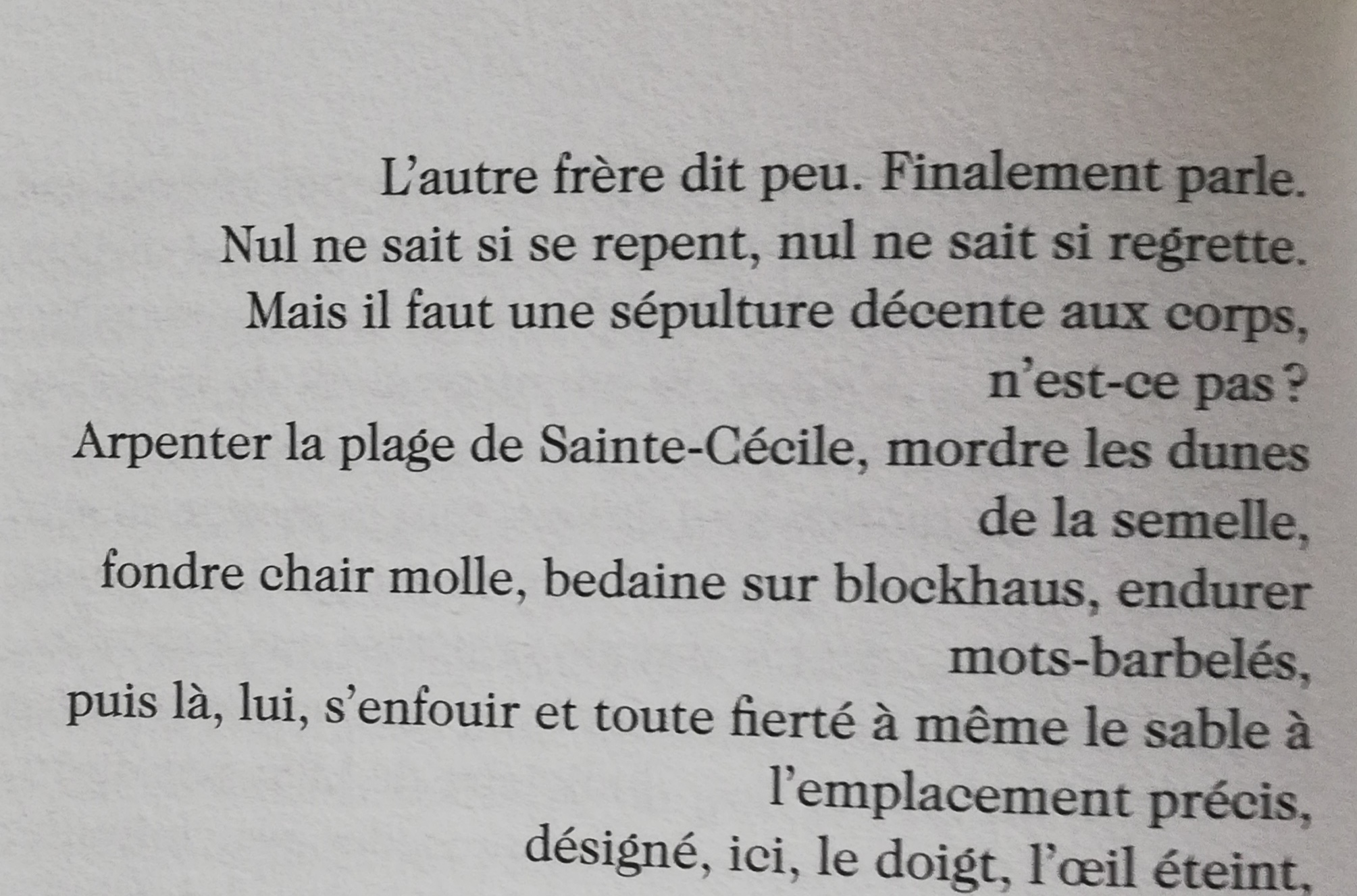 Il se dit qu’elle aurait vécu en dehors de la ville, au milieu des champs. C’est ce qu’il se dit, sans que personne n’en sache davantage. On peut imaginer le mouvement des hautes herbes agitées par le vent, un mouvement continu, ralenti ou vif selon les jours, un mouvement qu’on ne peut inverser dans le flux de l’histoire, dans celui de la vie. Chaque tige qui se balance en est l’illustration infime, chaque fourmi est un personnage de l’existence de cette mère et de son fils, chaque détail microscopique, chaque molécule le surgissement invisible, chaque être unicellulaire en modifie l’équilibre, l’avènement des épisodes, chaque événement s’enchaîne selon une logique qui échappe au commun. Comment pourrait-il en être autrement ?