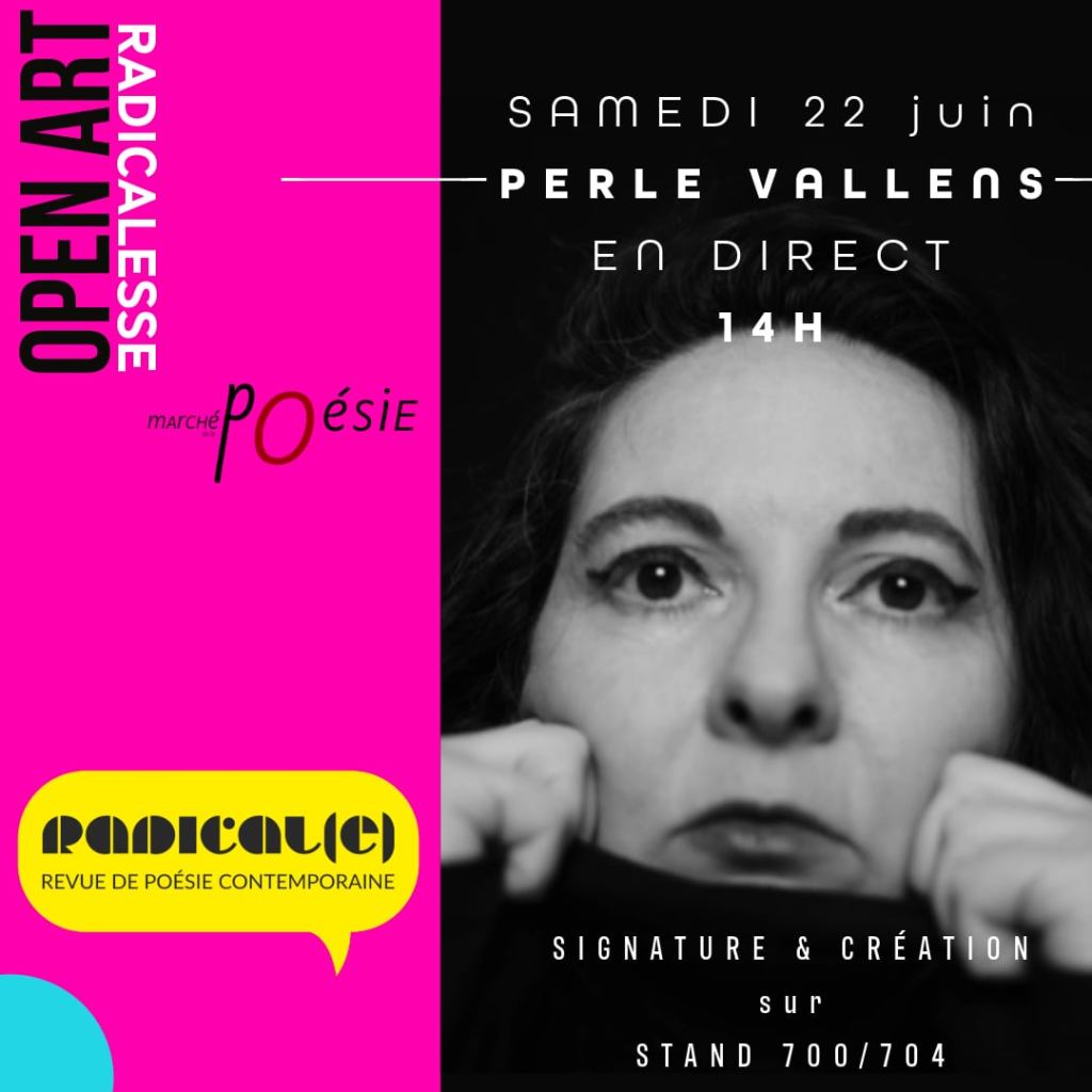 Je dédicacerai également (et dessinerai/écrirai in situ puisque c’est le concept open art/livre pauvre) sur le stand du tract poétique et féminin/féministe Radical(e) pour le nouvel opus de Guylaine Monnier et Amélie Guyot, qui accueille plusieurs de mes poèmes & photos (stand 700/704). La dédicace sera en « open art », avec dessin et graphie en direct. Venez !