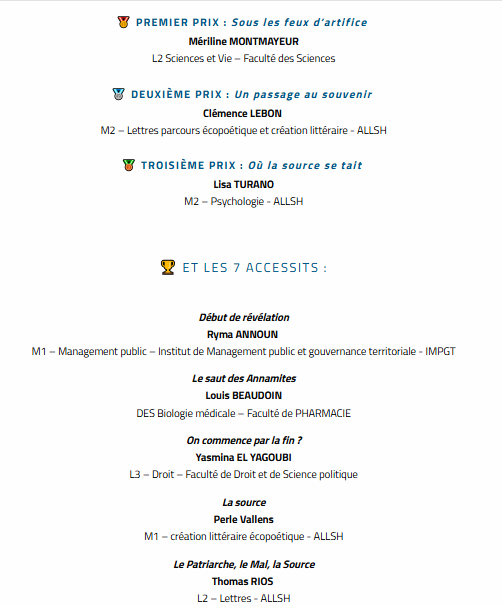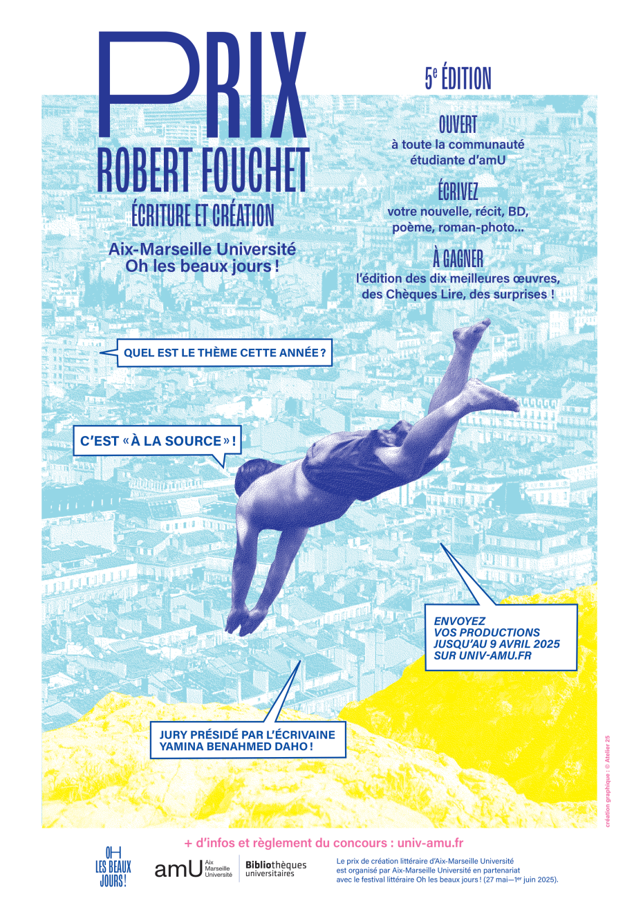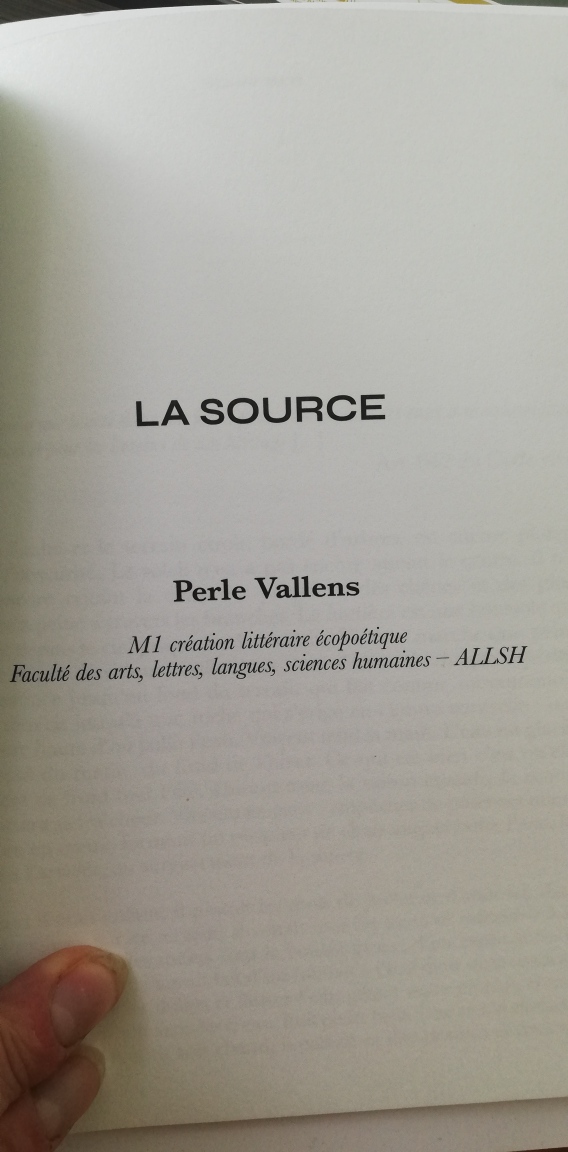 Etudiante depuis septembre 2024 en Master de création littéraire écopoétique d’Aix-Marseille, j’ai participé au Prix Écriture et Création « Robert Fouchet » 2025, organisé par l’université et le Festival Oh les Beaux jours ! Cette année, ce concours ouvert aux étudiant-es avait pour thème « À la source ». Une étudiante en deuxième année du Master, Clémence Lebon, est deuxième, bravo à elle ! Pour ma part, je suis parmi les 10 finalistes et j’en suis ravie. Les dix textes devraient figurer dans un recueil édité par l’université.