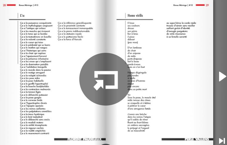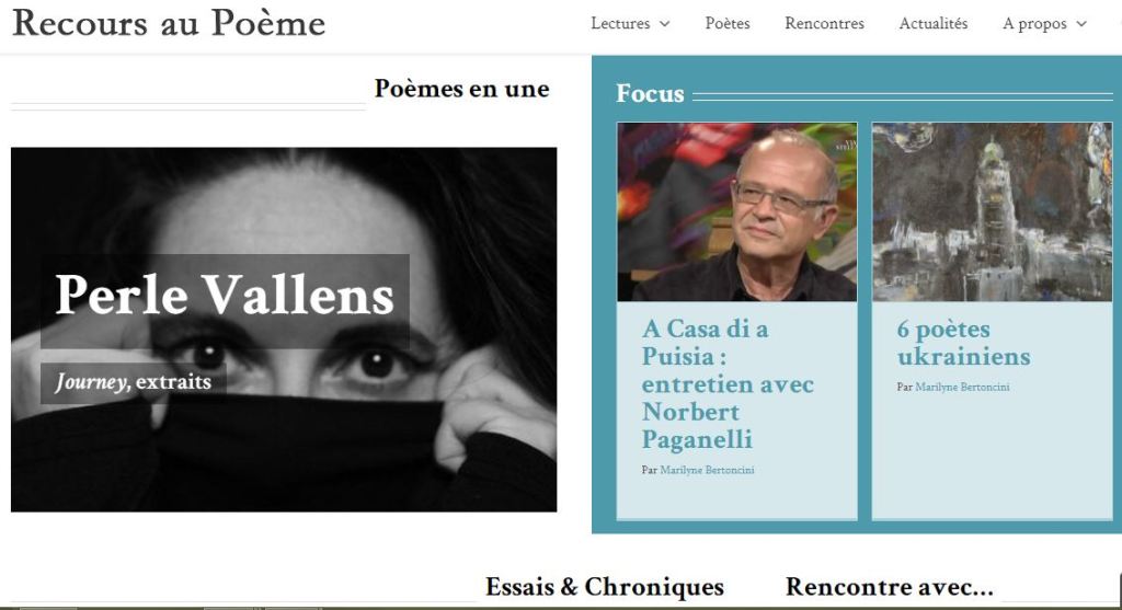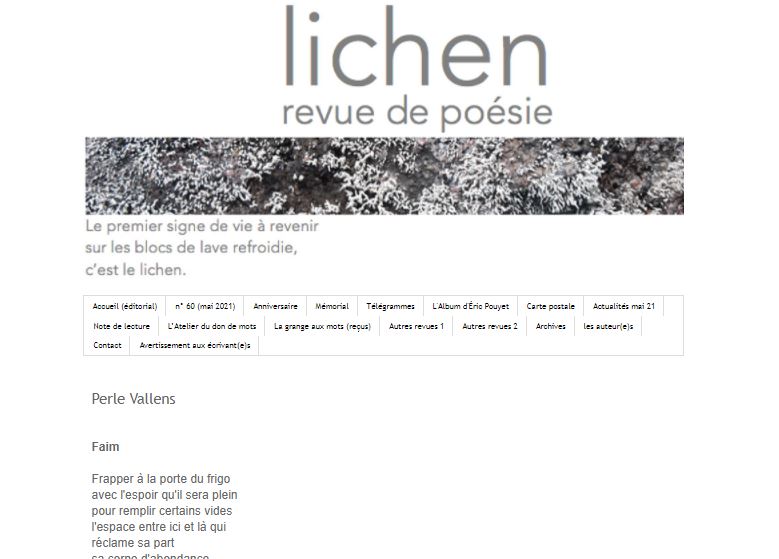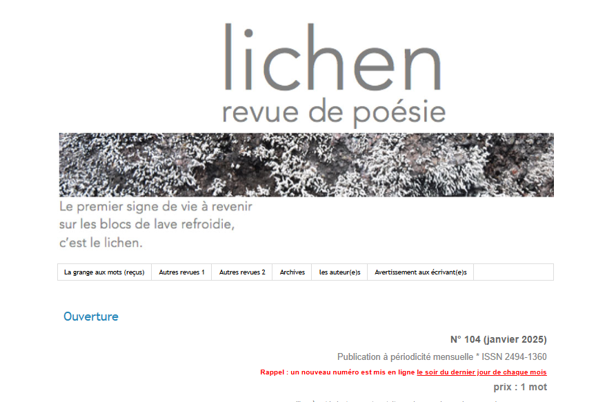 Jusqu’à 2023 : Le Nouveau décadent, Jupiter, La Syncopée, Labyrinthe[s, La Variation, Le Ventre et l’Oreille, Nouveaux Délits, Recours au poème, Teste, En marges, Pro/p(r)ose, Région Centrale, La Piscine, FPM, Cairns, Mot à maux, L’air de rien, Lichen, Miroir, Résonances, Revue Dissonances, Cabaret, Poesiemuziketc, Revue Métèque, Revue Méninge…